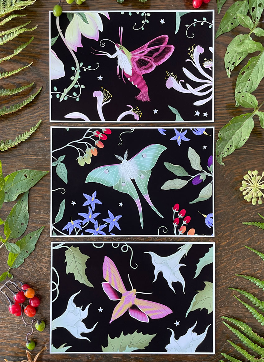 A set of 3 postcard sized Art Prints featuring Clear Wing Moth, Luna Moth and the Beautiful Elephant Hawk Moth illustrations with a rich black background.